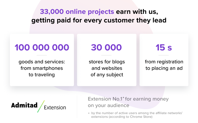Admitad Extension is one of the leading CPA-based earning tools among such rivals as MyAwin (Awin), CJ.com (CJ), VigLink Extension, Optimise Deeplink Generator, PeerFly Stats, CPAlead Statistics, Lomadizador de links (Lomadee), Skimlinks Editor tool, ePN Webmaster Plugin, Impact Deeplinking, Walmart Affiliates Ad Generator, and Amazon Associates.