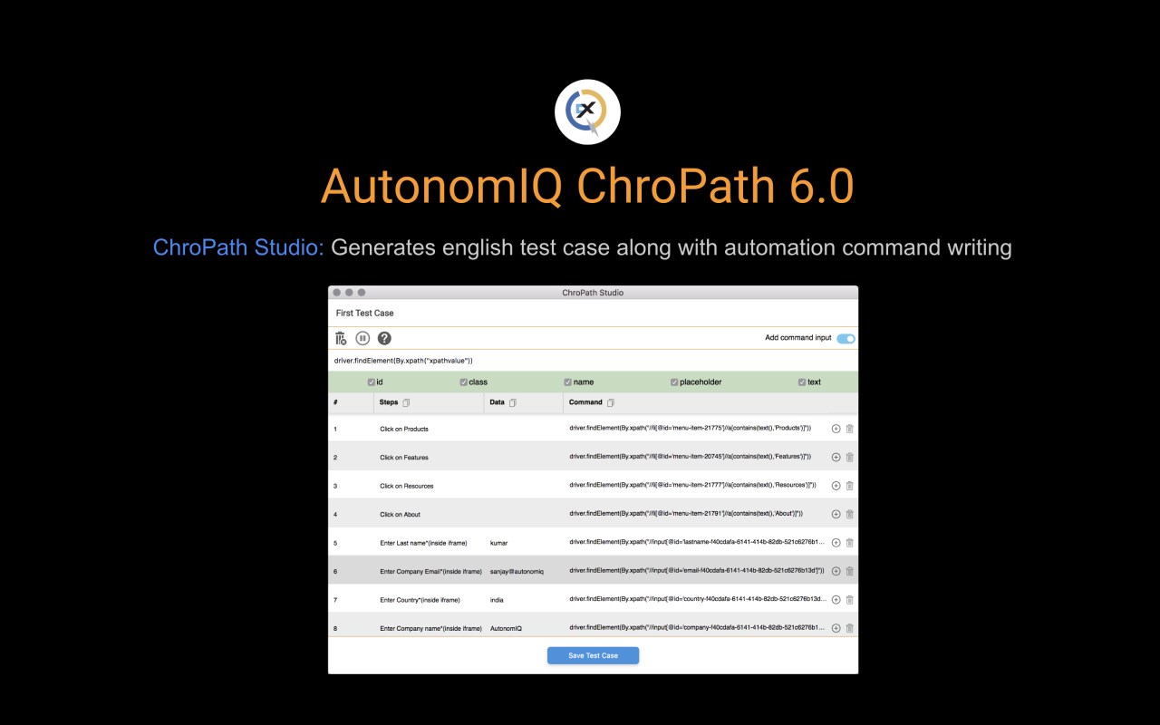 ChroPath generates all possible selectors just by one click. ChroPath can also be used as an Editor for selectors. It makes it easy to write, edit, extract and evaluate XPath queries on any webpage. ChroPath Studio helps to record all manual steps along with automation steps. With the smart maintenance feature, all paths can be verified from the script. ChroPath also supports iframe, multi selectors generation, dynamic attributes, generate relative XPath with custom attribute, automation script steps generation.