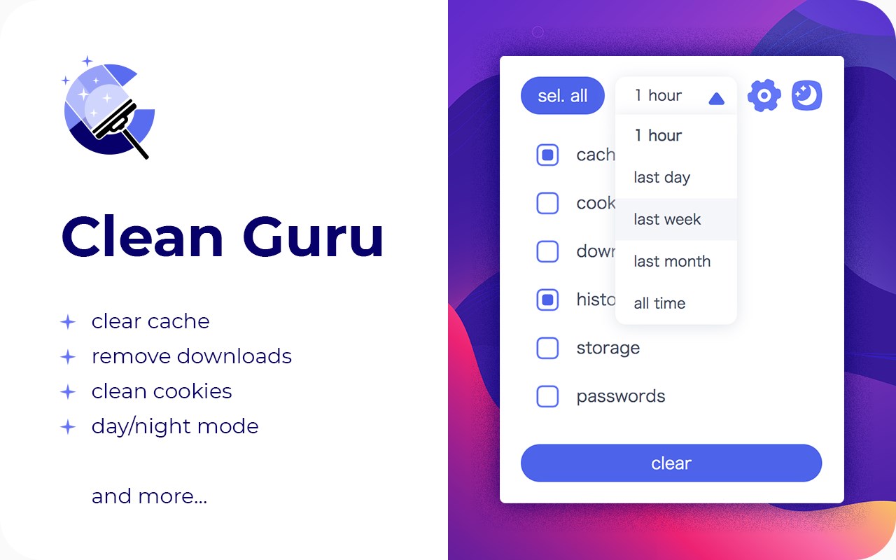 Chrome Clean Guru is a useful browser extension that helps you quickly clean up the browser. and It helps to delete all traces of your online activity to protect your privacy.
