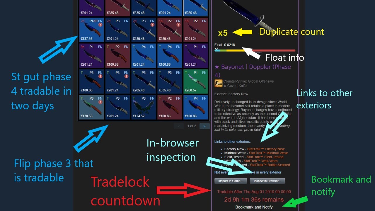 – Shows floats and other technical info like paint index, paint seed, pattern index in inventories, offers, and on the market