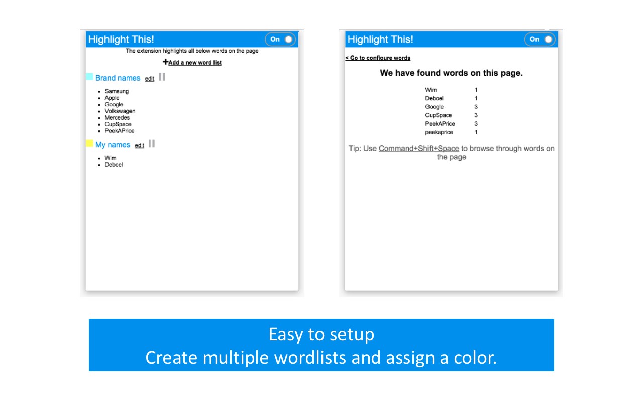 Easy to use Extension that automatically searches for defined words in the current browser tab and marks them in a text. Many more advanced features are available through settings: