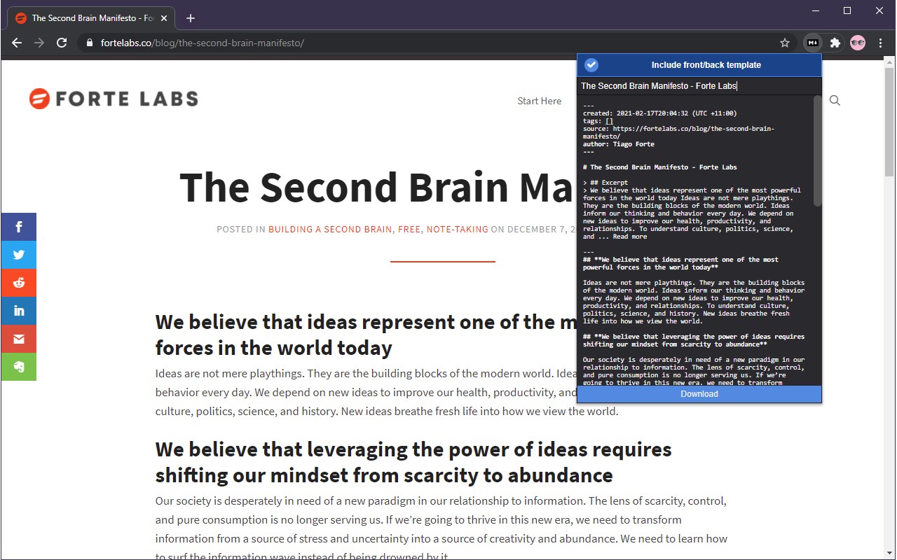 This is an extension to clip websites and download them into a readable markdown file. Please keep in mind that it is not guaranteed to work on all websites.